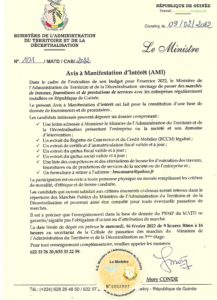 Non classé MINISTÈRE DE L’ADMINISTRATION DU TERRITOIRE ET DE LA DÉCENTRALISATION : AVIS À MANIFESTATION D’INTÉRÊT (AMI) N°101/MATD/CAB/2022 9 février 2022 18h48 by amadouksccopguinee Views: 61 Copie Avis à manifestation d’intérêt