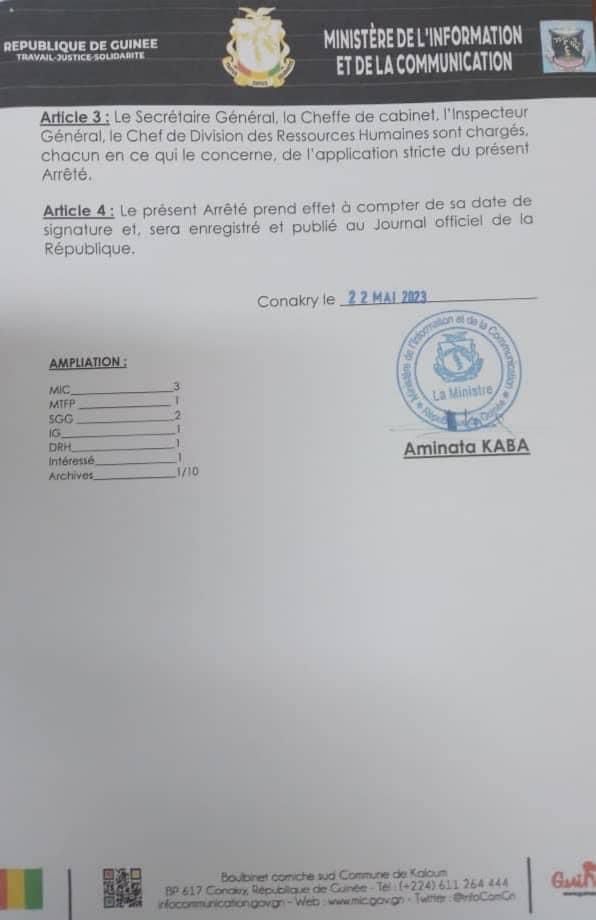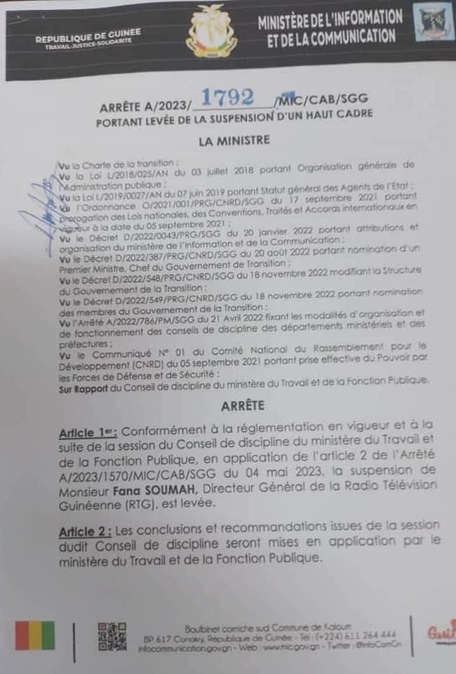 Après plusieurs jours de contestation des travailleurs de la RTG contre la suspension du directeur général de la radio télévision guinéenne, la ministre Aminata Kaba dans un arrêté en date de ce lundi 22 mai 2022 a levé la suspension de Fana Soumah et de son rédacteur en chef.