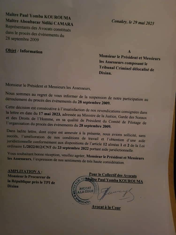 A travers une lettre adressée au président du tribunal et aux assesseurs dont copie est parvenue lundi 29 mai à notre rédaction, les avocats du procès des événements du 28 septembre 2009 ont annoncé la suspension de leur participation à ce procès.