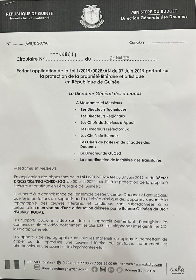 Désormais, les importations des supports audio et vidéo et ainsi que les appareils servant de reprographie des œuvres littéraires et artistiques sont subordonnées à la présentation d’un visa ou d’une autorisation délivrée par le Bureau Guinéen du droit d’auteur (BGDA).
