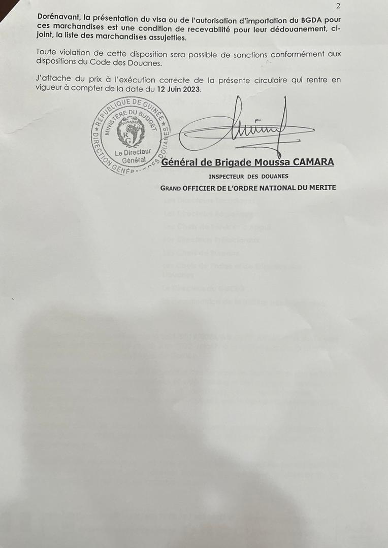 C’est une décision de directeur général des douanes le général de brigade Moussa Camara qui a signé une note circulaire…