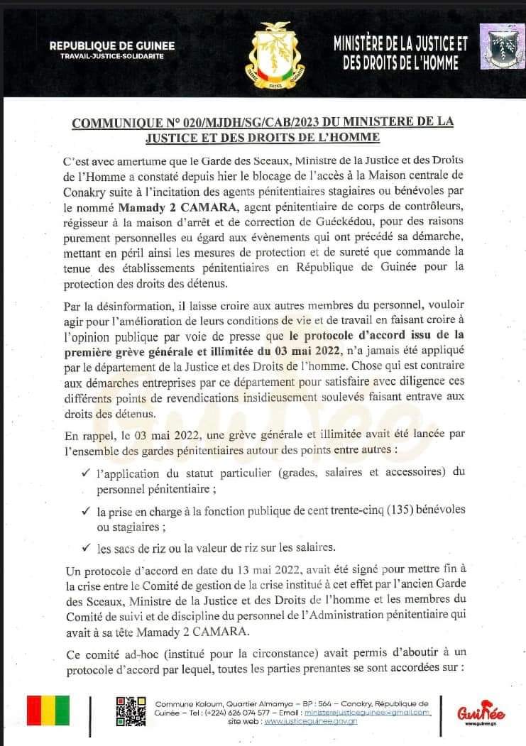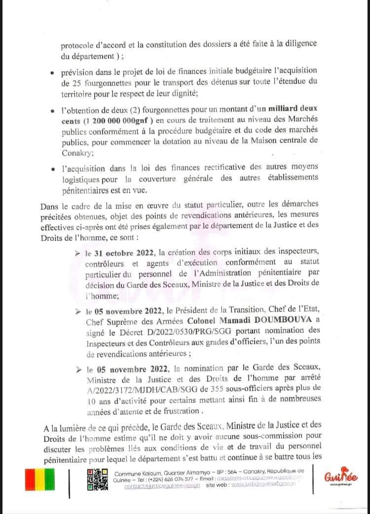 Au regard des résultats obtenus par les efforts sans cesse du Gouvernement, le Garde des Sceaux, Ministre de la Justice et des Droits de l’homme invite le personnel de l’Administration pénitentiaire à se désolidariser de cette démarche personnelle de Mamady 2 CAMARA et les invite à toutes discussions utiles, courtoises pour éviter de plonger la maison centrale en situation de détresse et de stresse pour les détenus.