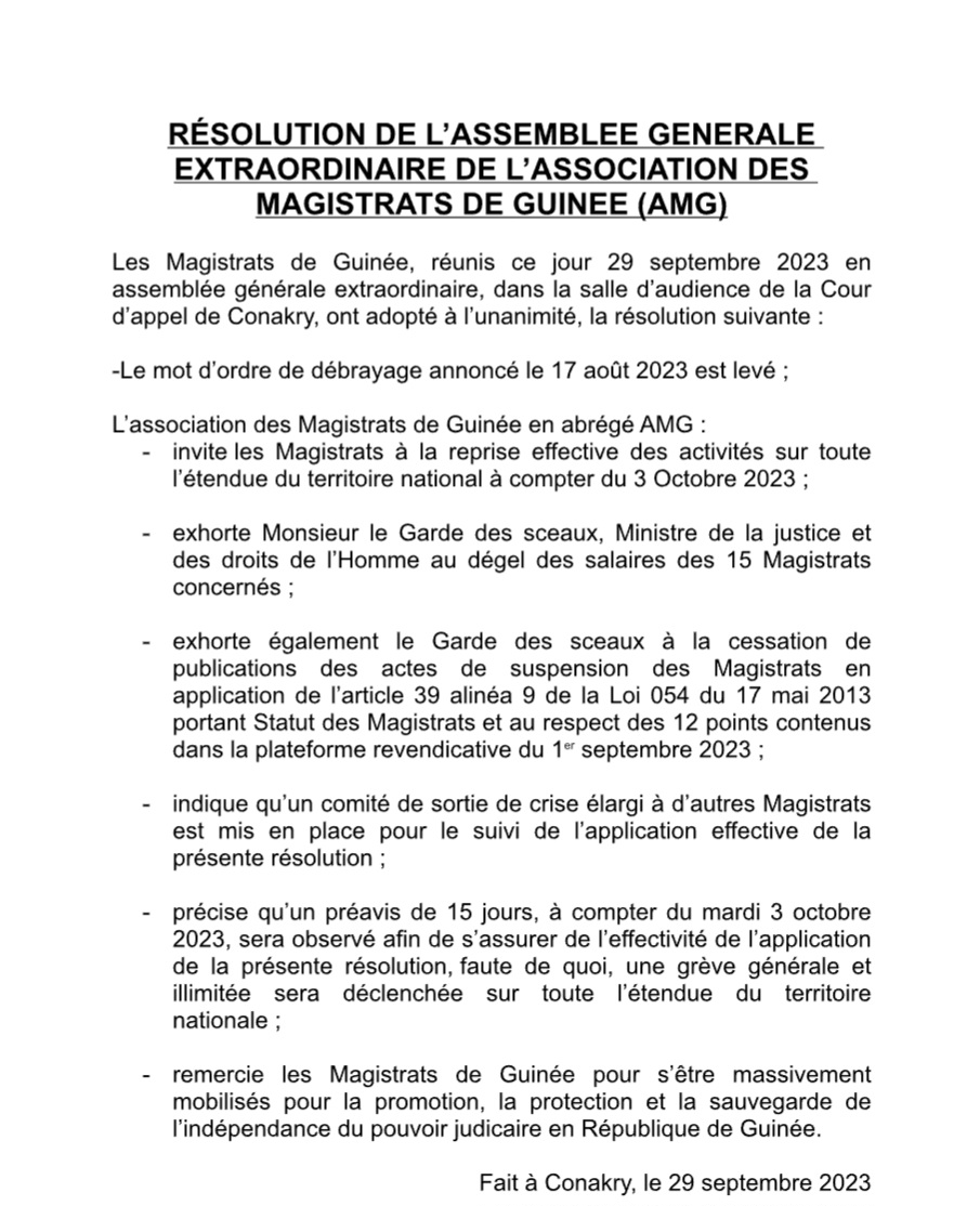 Dans une résolution dont nous avons copie, l’ AMG annonce la levée du mot d’ordre de débrayage lancé depuis le 17 août dernier.
