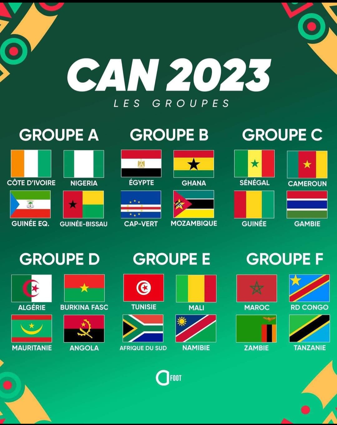 La Confédération Africaine de Football (CAF) a effectué ce jeudi 12 octobre 2023 en Côte d’Ivoire, le tirage au sort de la coupe d’Afrique des Nations, CAN Côte d’Ivoire 2023.
