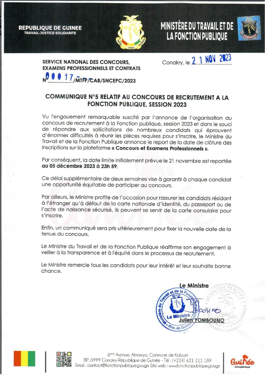 Selon un communiqué du département en charge du Travail et de la fonction, la date limite des inscriptions pour ce concours tant attendue, est reportée au 05 décembre 2023 à 23h59.