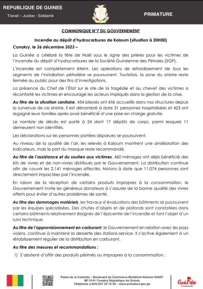 Dans un communiqué publié ce mardi dans les médias, le gouvernement guinéen a de nouveau dresser le bilan de l’explosion récente survenue au dépôt d’hydrocarbures de Kaloum, faisant plusieurs morts, des blessés et d’importants dégâts matériels.