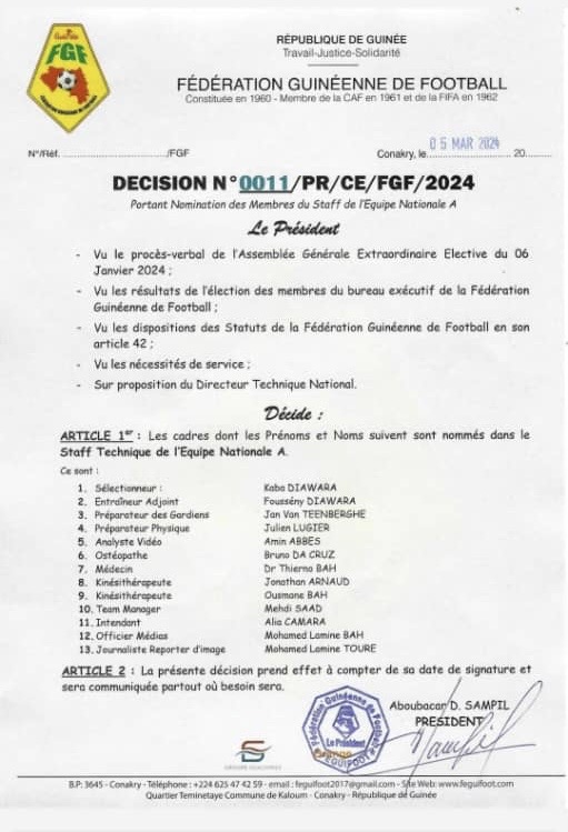 Ci-dessous la nouvelle composition du staff technique de la sélection guinéenne :