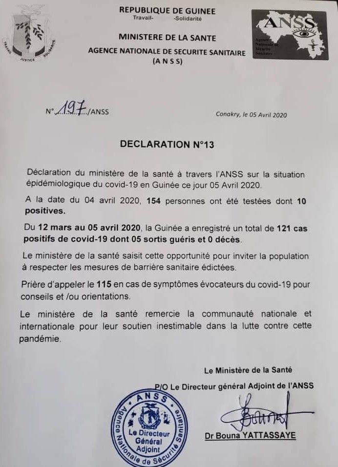 COVID-19 en Guinée: 121 cas positifs dont 5 guéris et zéro décès à la date du 5 avril 2020, selon l’ANSS