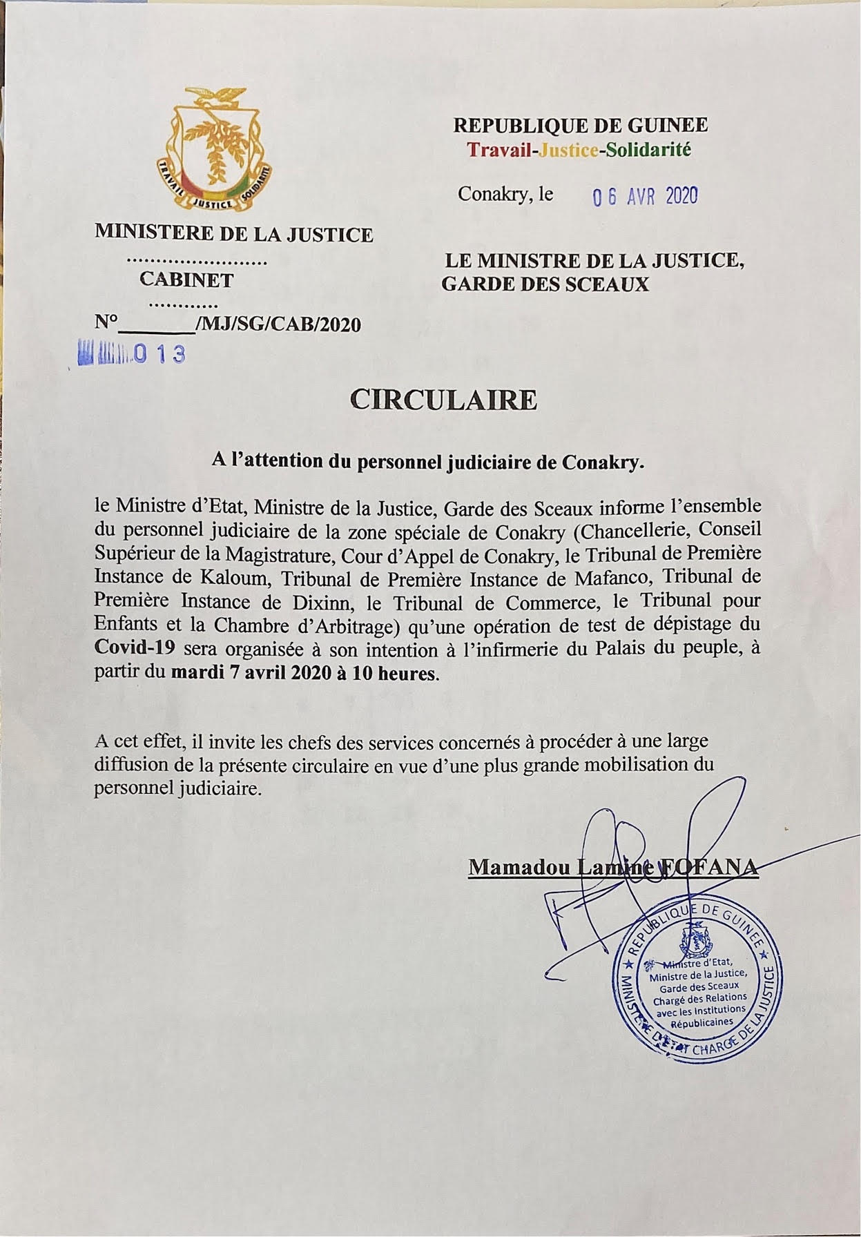 Justice/COVID-19: le ministre recommande à tout son personnel de Conakry de se faire tester à partir de ce mardi – Communiqué